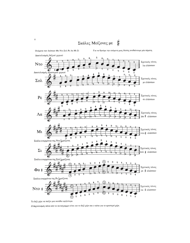 Υπάρχουν 12 σκάλες μείζονες (ματζόρε) και 12 σκάλες ελάσσονες (μινόρε). Κάθε μείζονα σκάλα έχει μία αντίστοιχη ελάσσονα σκάλα (σχετική) και κάθε ελάσσονα σκάλα έχει μία αντίστοιχη μείζονα σκάλα (σχετική). Υπάρχουν τρεις τύποι στις ελάσσονες σκάλες που ονομάζονται 1ος, 2ος και 3ος τύπος ή αρμονικός, μελωδικός και αρχαϊκός αντίστοιχα. Ο 3ος τύπος επειδή δεν χρησιμοποιείται πια, δεν αναφέρεται καθόλου σ αυτό το τεύχος.